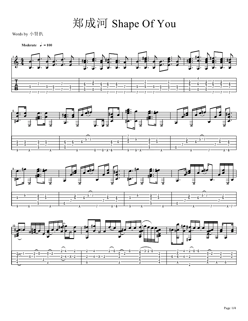 吉他郑成河《shape of you》吉他谱_吉他指弹六线谱_小贤编配