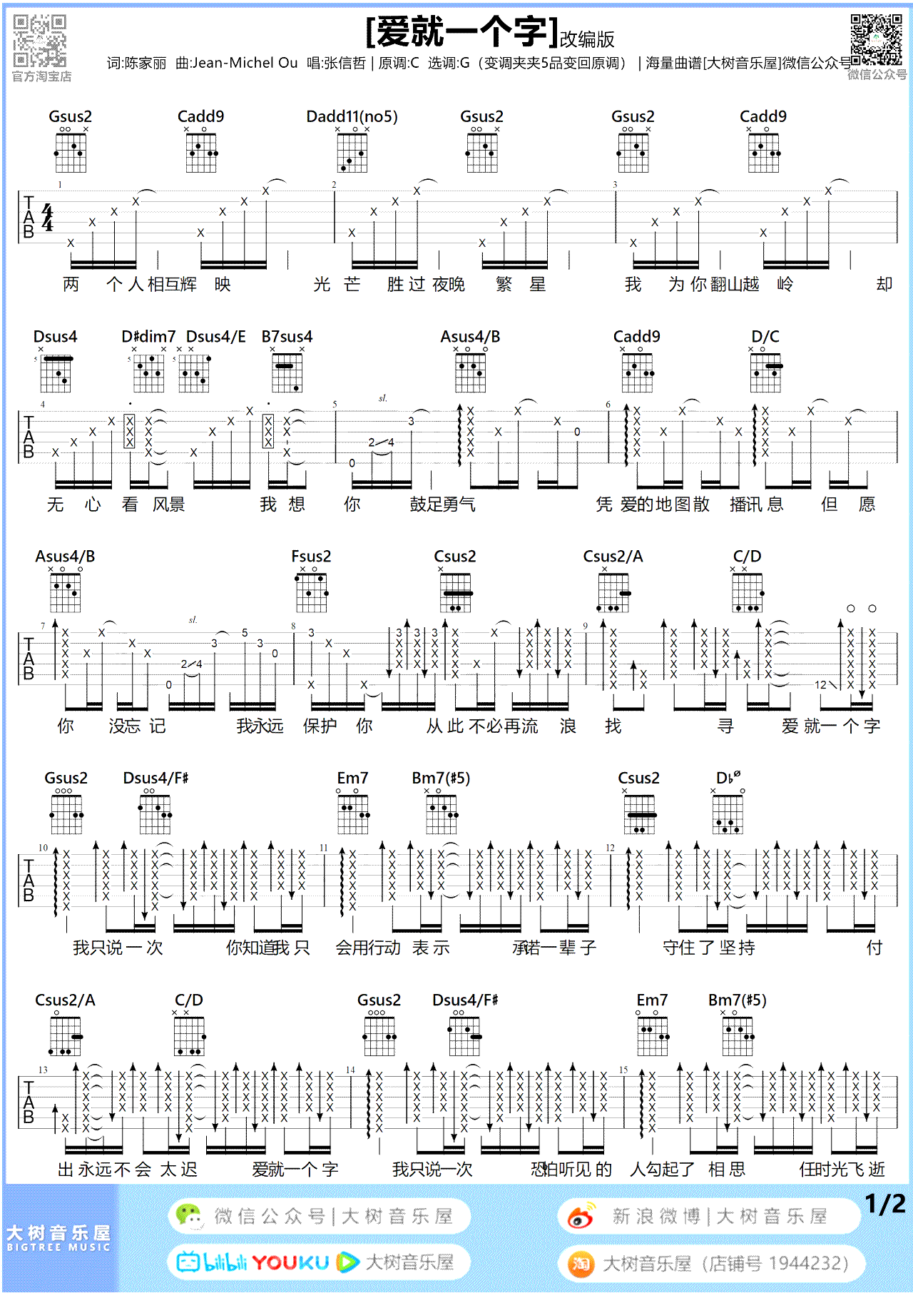 吉他张信哲/V仔《爱就一个字》吉他谱_吉他弹唱谱