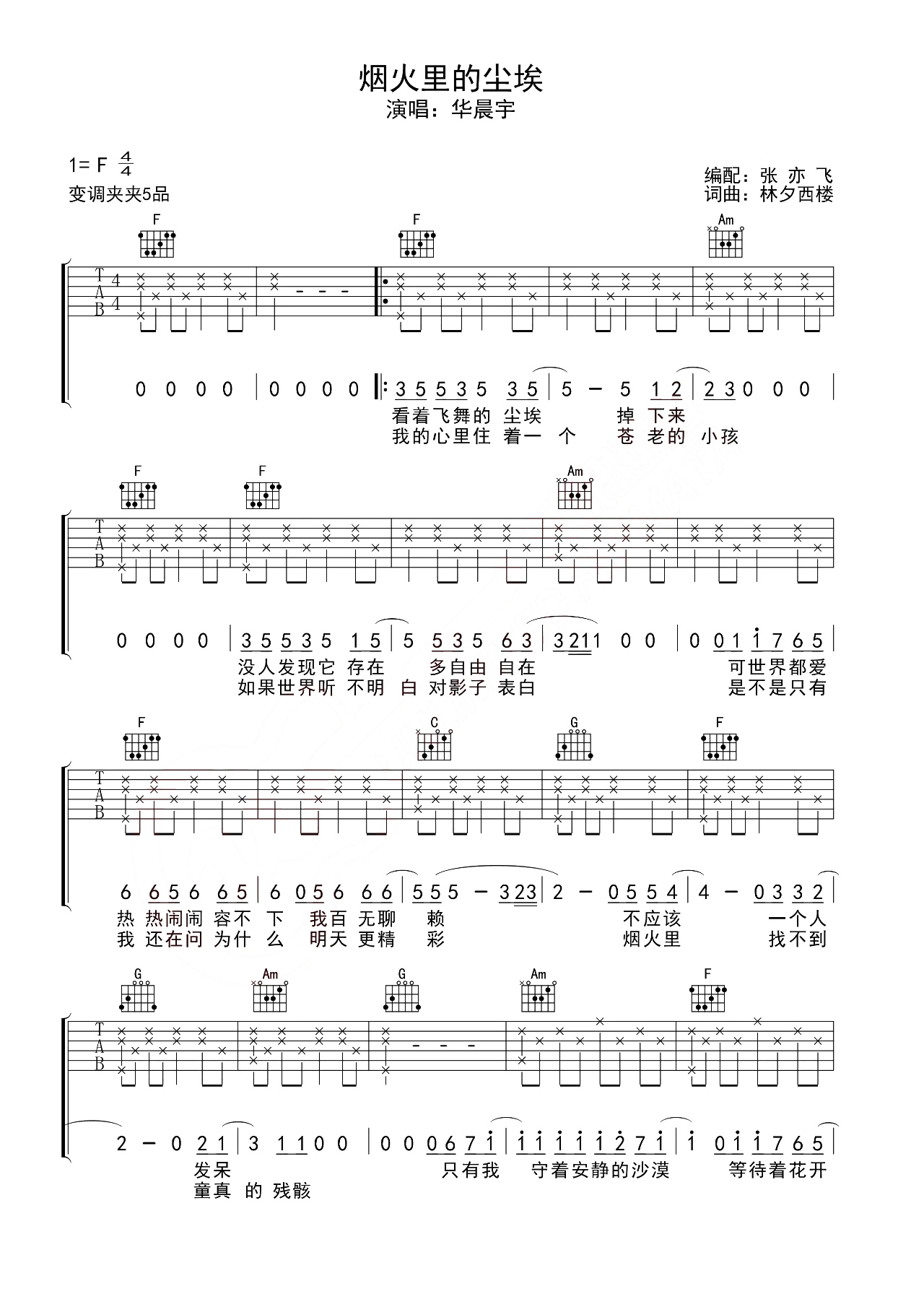 华晨宇《烟火里的尘埃》吉他谱,无限延音编配出品,共有5张高清图谱。...