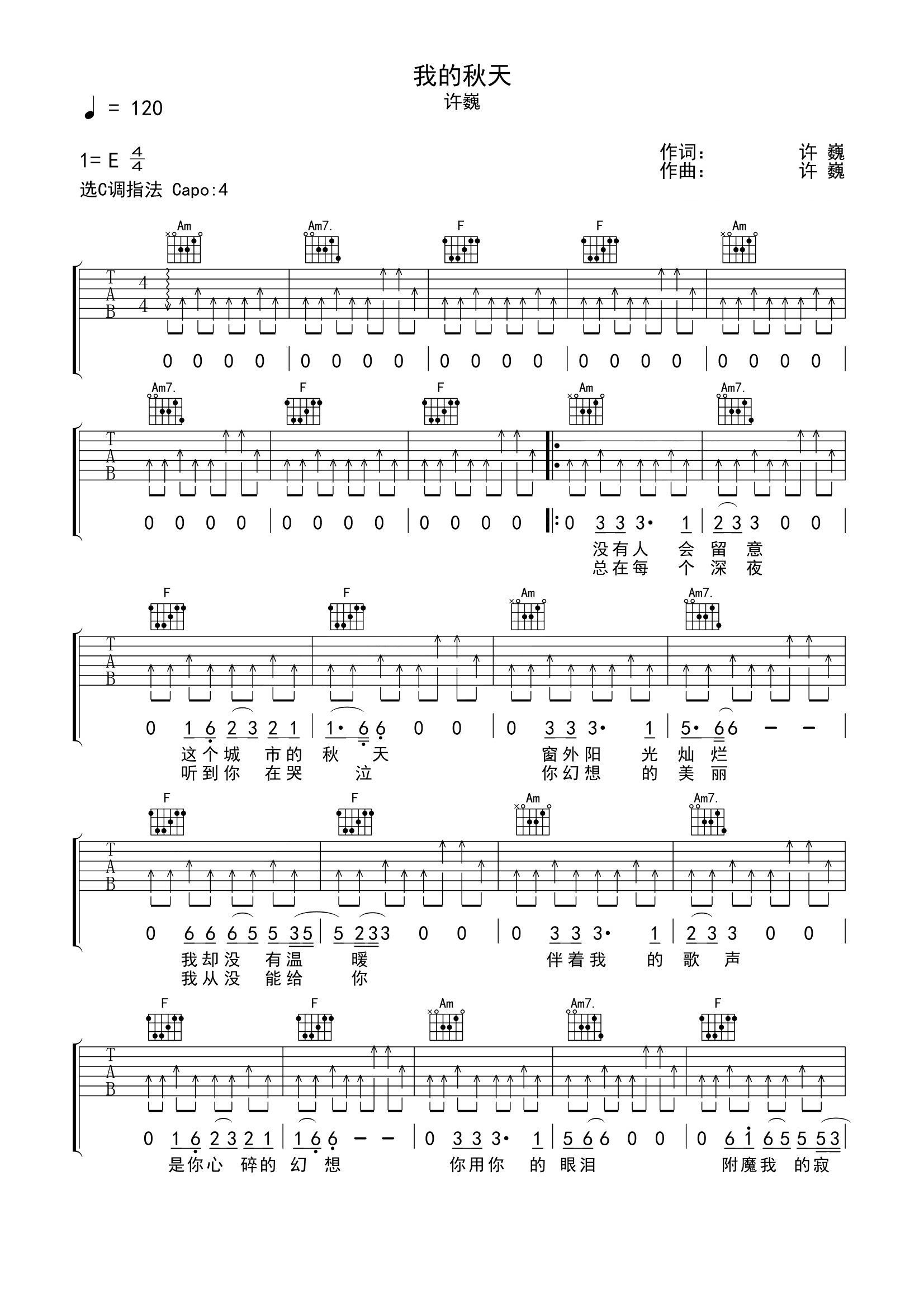 吉他许巍《我的秋天》吉他谱_吉他弹唱谱