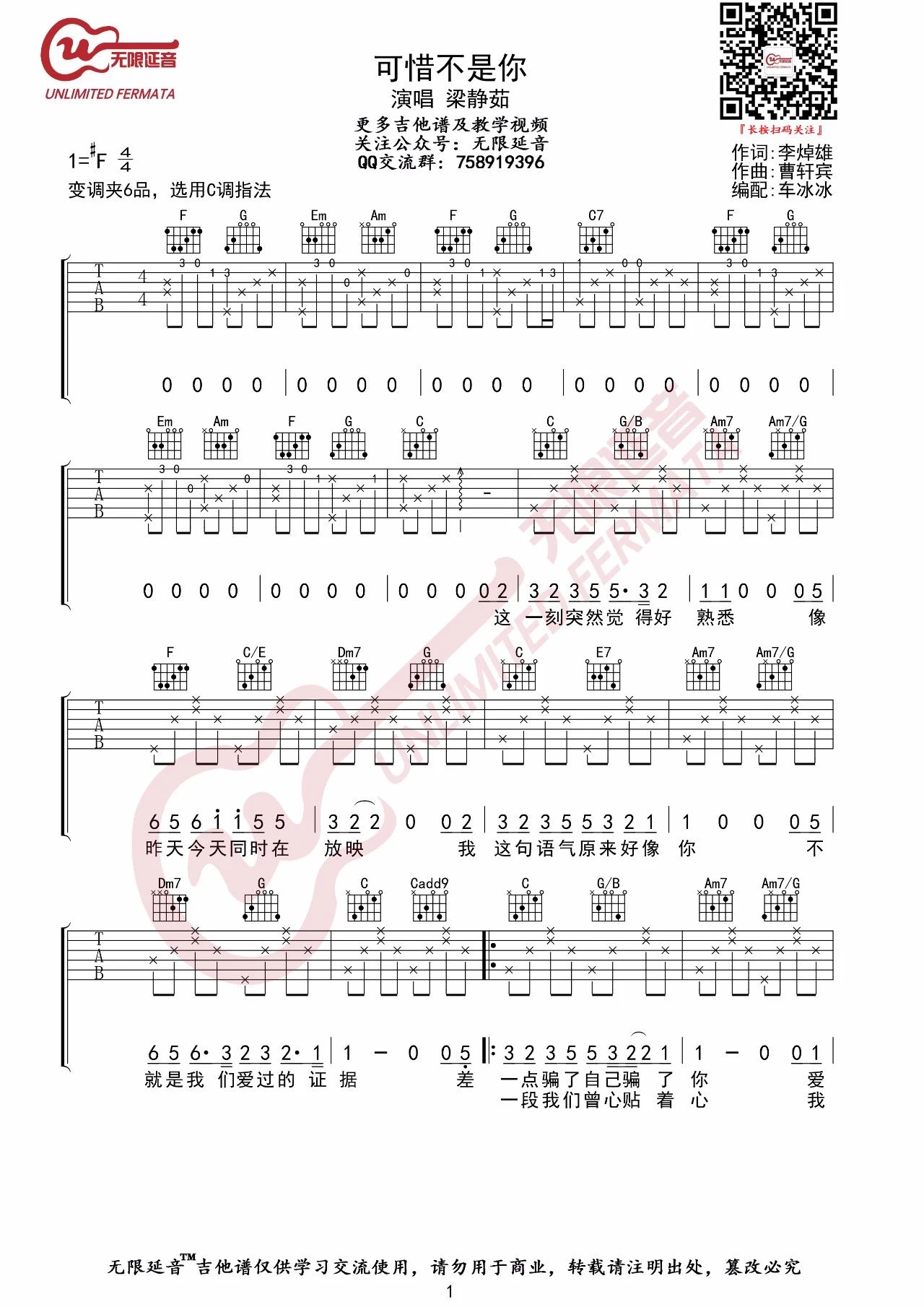 吉他梁静茹《可惜不是你》吉他谱_吉他弹唱谱_无限延音编配
