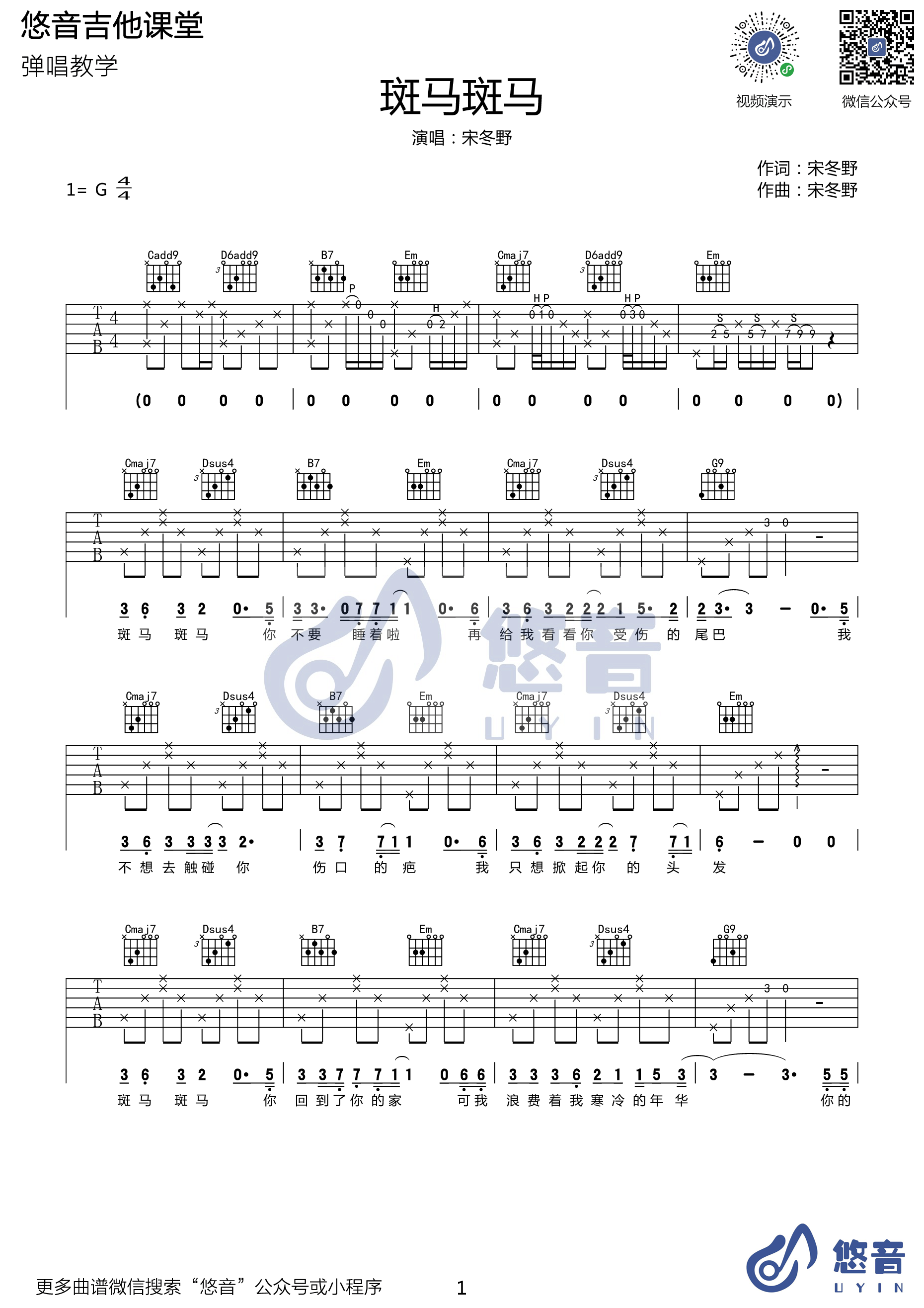 吉他宋冬野《斑马斑马》吉他谱_吉他弹唱谱_悠音编配