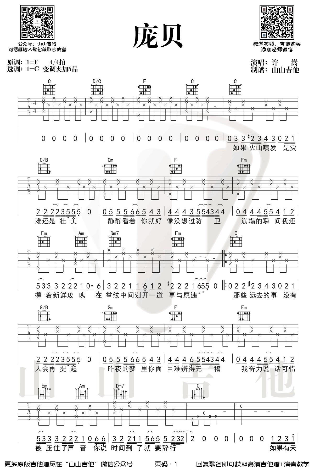 吉他许嵩《庞贝》吉他谱_吉他弹唱谱_山山吉他编配