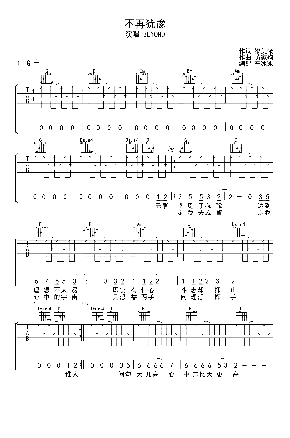 Beyond《不再犹豫》吉他谱,无限延音编配出品,共有2张高清图谱,免翻页排版设计。...