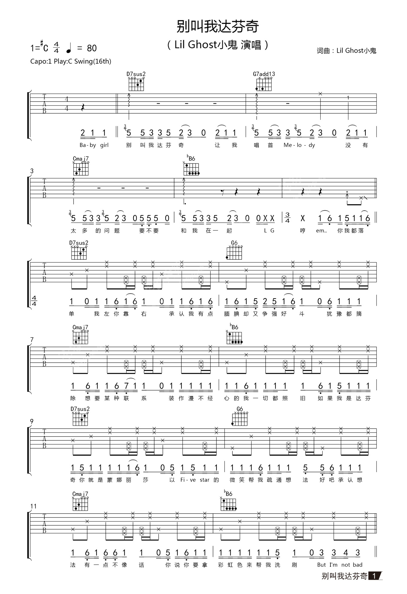 吉他Lil Ghost 小鬼《别叫我达芬奇》吉他谱_吉他弹唱谱