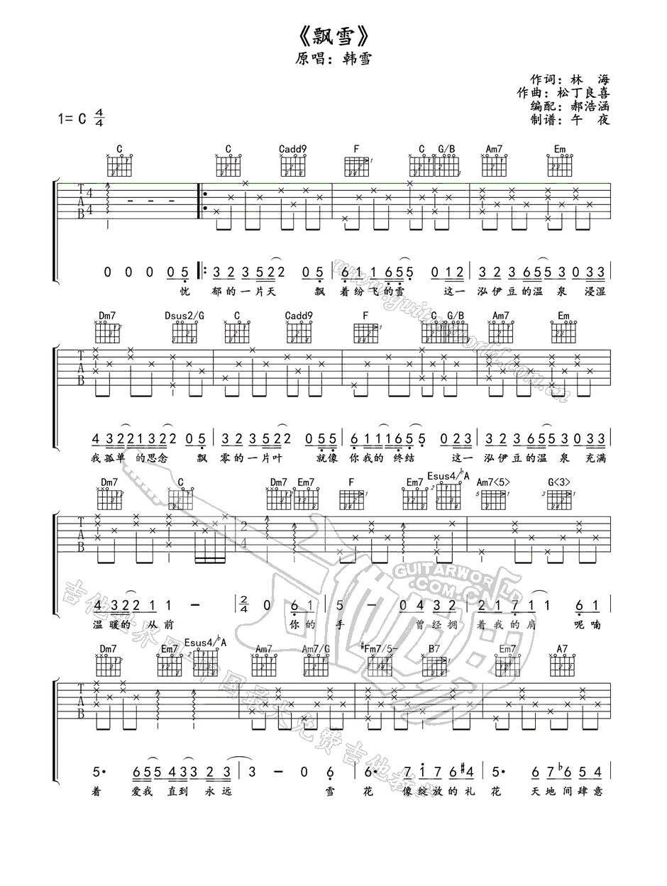 吉他韩雪《飘雪》吉他谱_吉他弹唱谱_午夜编配