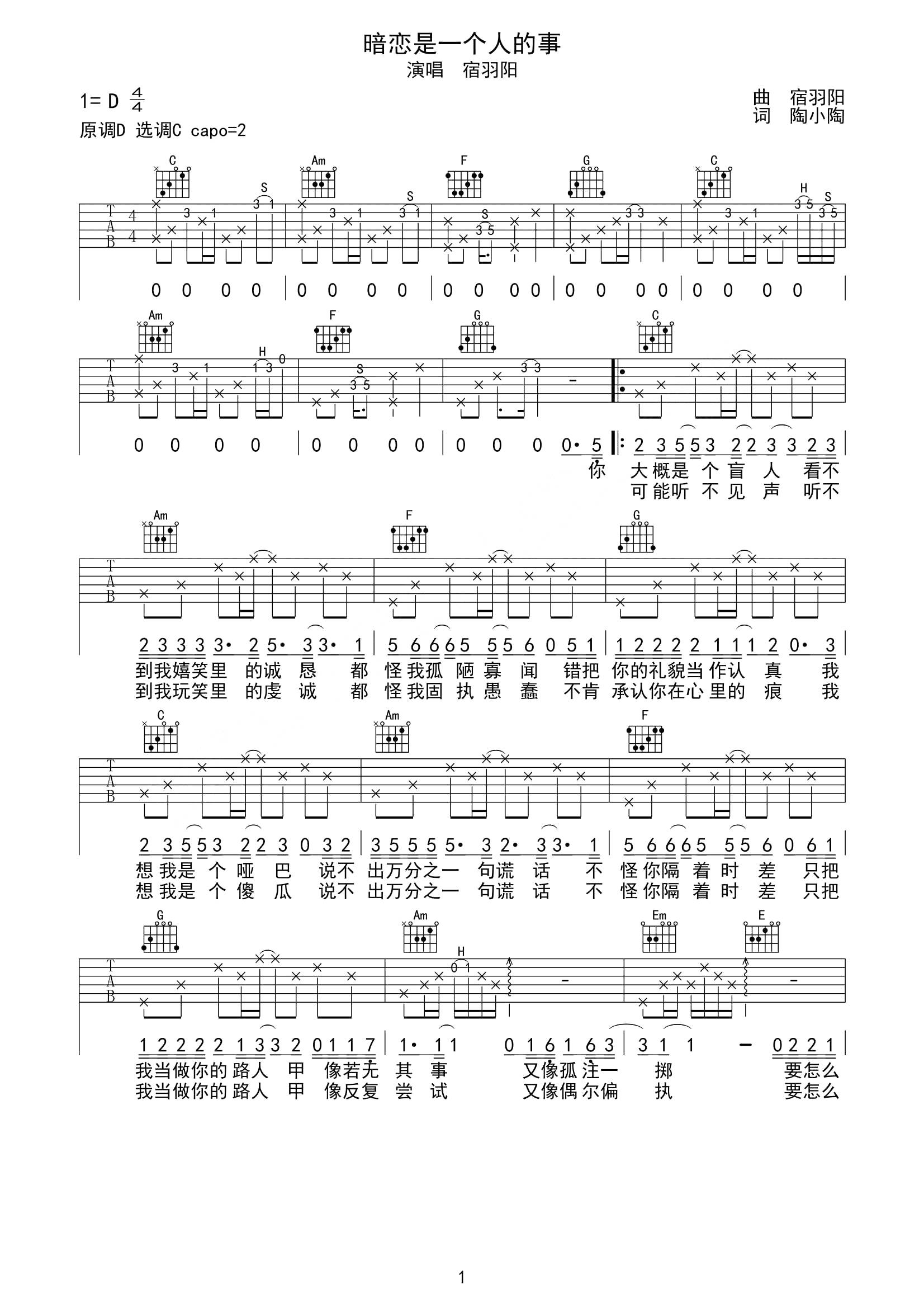 宿羽阳《暗恋是一个人的事》吉他谱,共有3张高清图谱。...