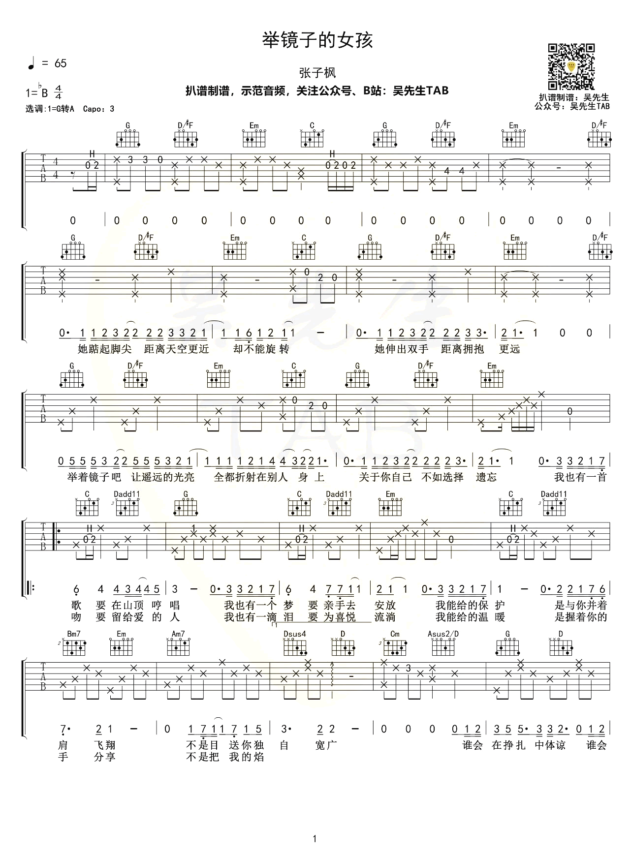 吉他张子枫《举镜子的女孩》吉他谱_吉他弹唱谱_吴先生TAB编配
