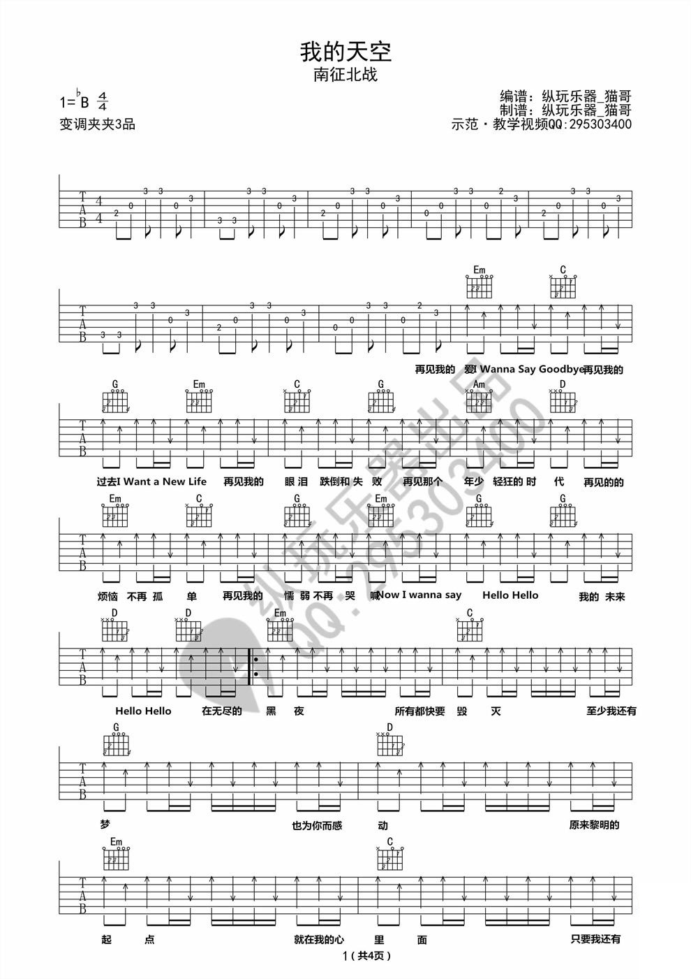 南征北战《我的天空》吉他谱,纵玩乐器编配出品,共有4张高清图谱。...