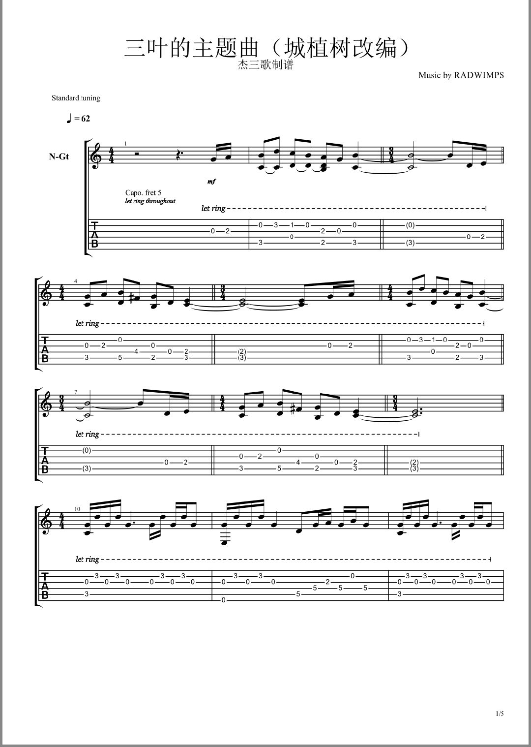 城植树《三叶的主题曲》吉他谱,杰三歌编配出品,共有5张高清图谱。...