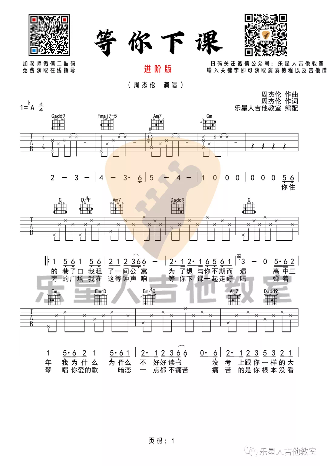 周杰伦《等你下课》吉他谱,乐星人教室编配出品,共有3张高清图谱。...