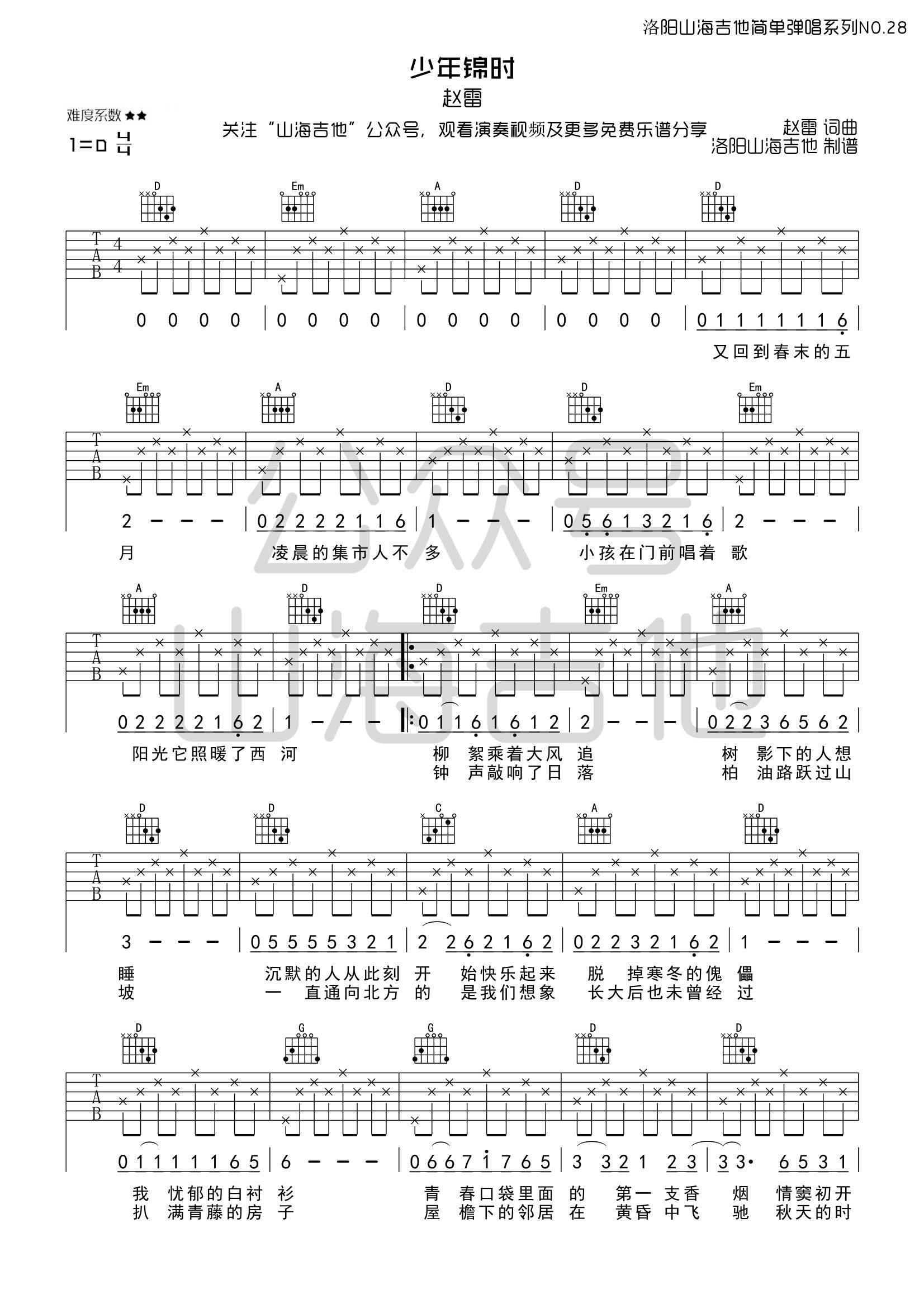 吉他赵雷《少年锦时》吉他谱_吉他弹唱谱_何奔洋编配