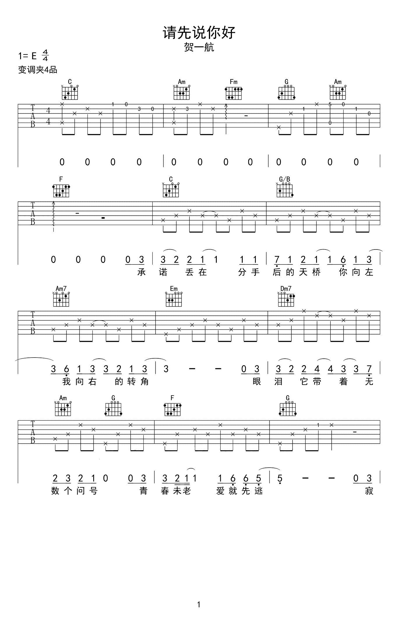 请先说你好吉他谱,贺一航演唱的热门抖音歌曲,原调E,变调夹夹四品。歌可以单曲循环,人一旦错过就不再有。最近一直在单曲循环一首歌,略带嘶哑的深情演唱,太容易把人扔进回忆里去。...