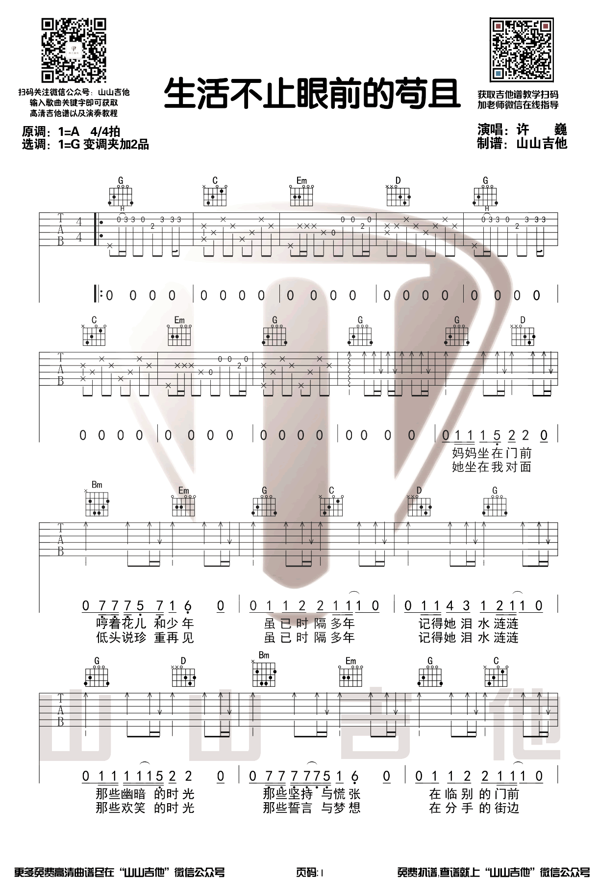 吉他许巍《生活不止眼前的苟且》吉他谱_吉他弹唱谱_山山吉他编配