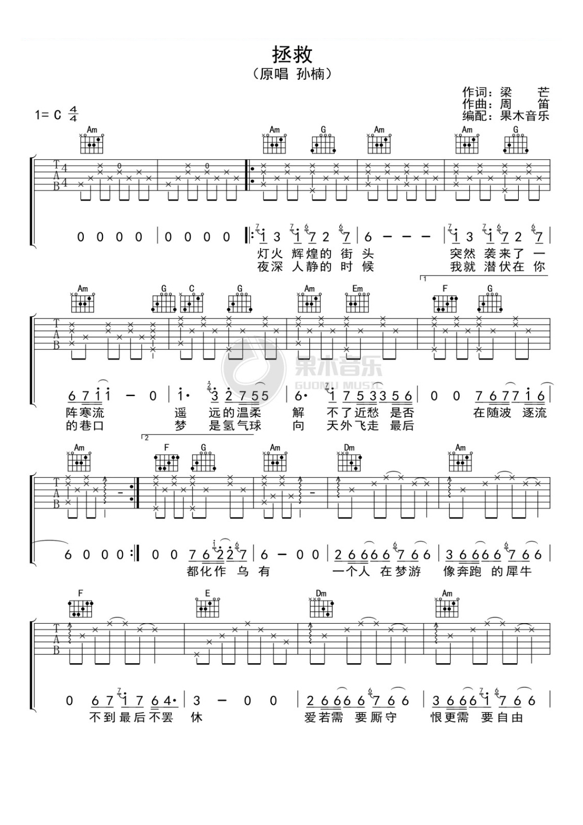 吉他孙楠《拯救》吉他谱_吉他弹唱谱_果木音乐编配