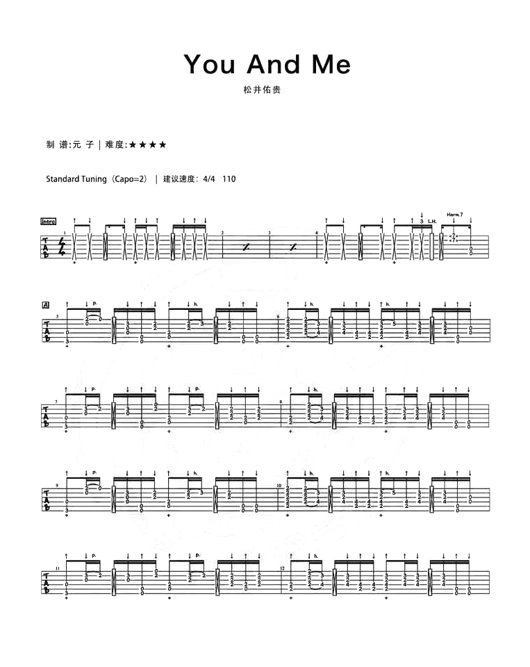 吉他松井祐贵《you and me》吉他谱_吉他指弹六线谱_元子编配