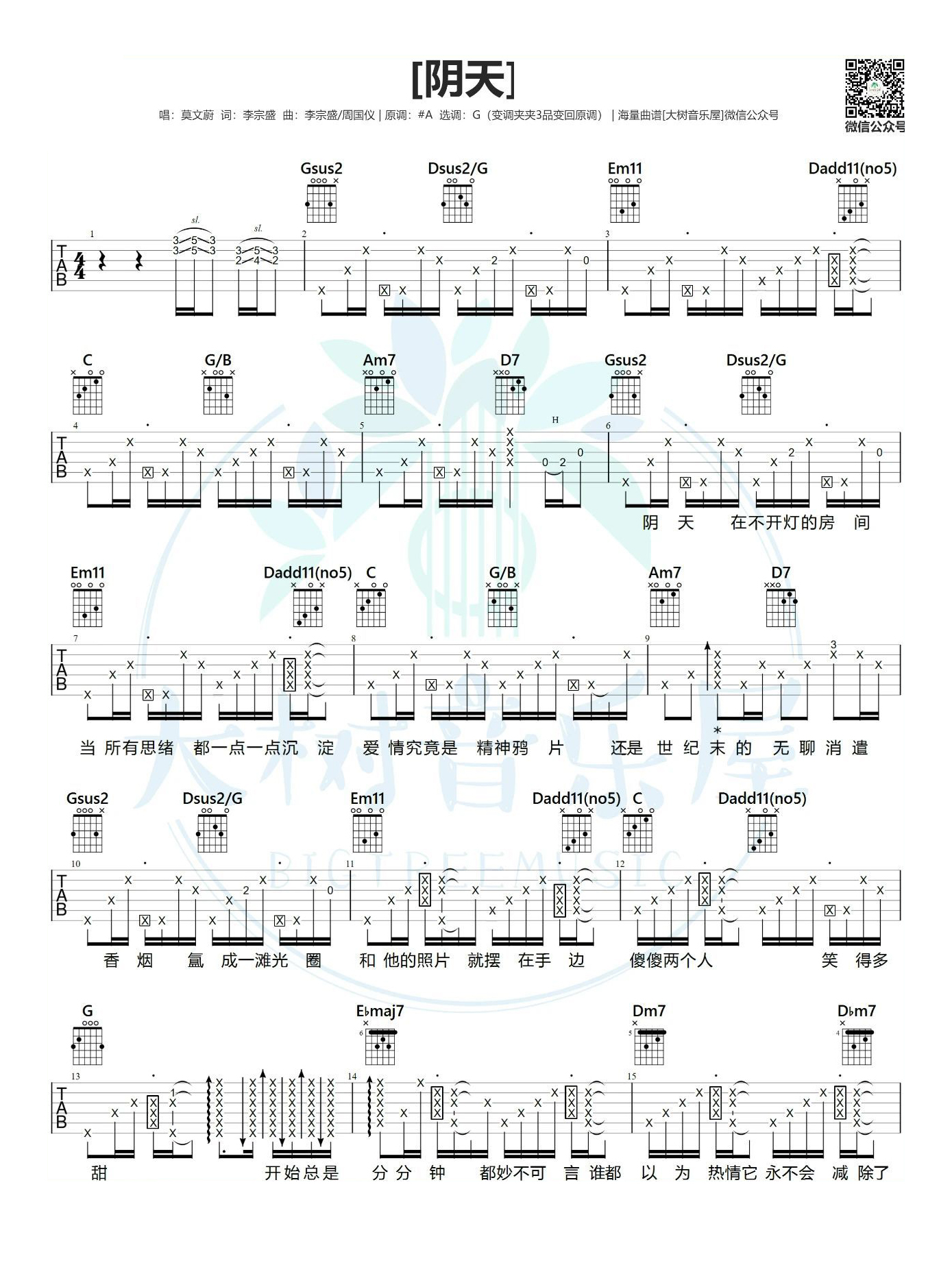吉他莫文蔚《阴天》吉他谱_吉他弹唱谱_大树音乐编配