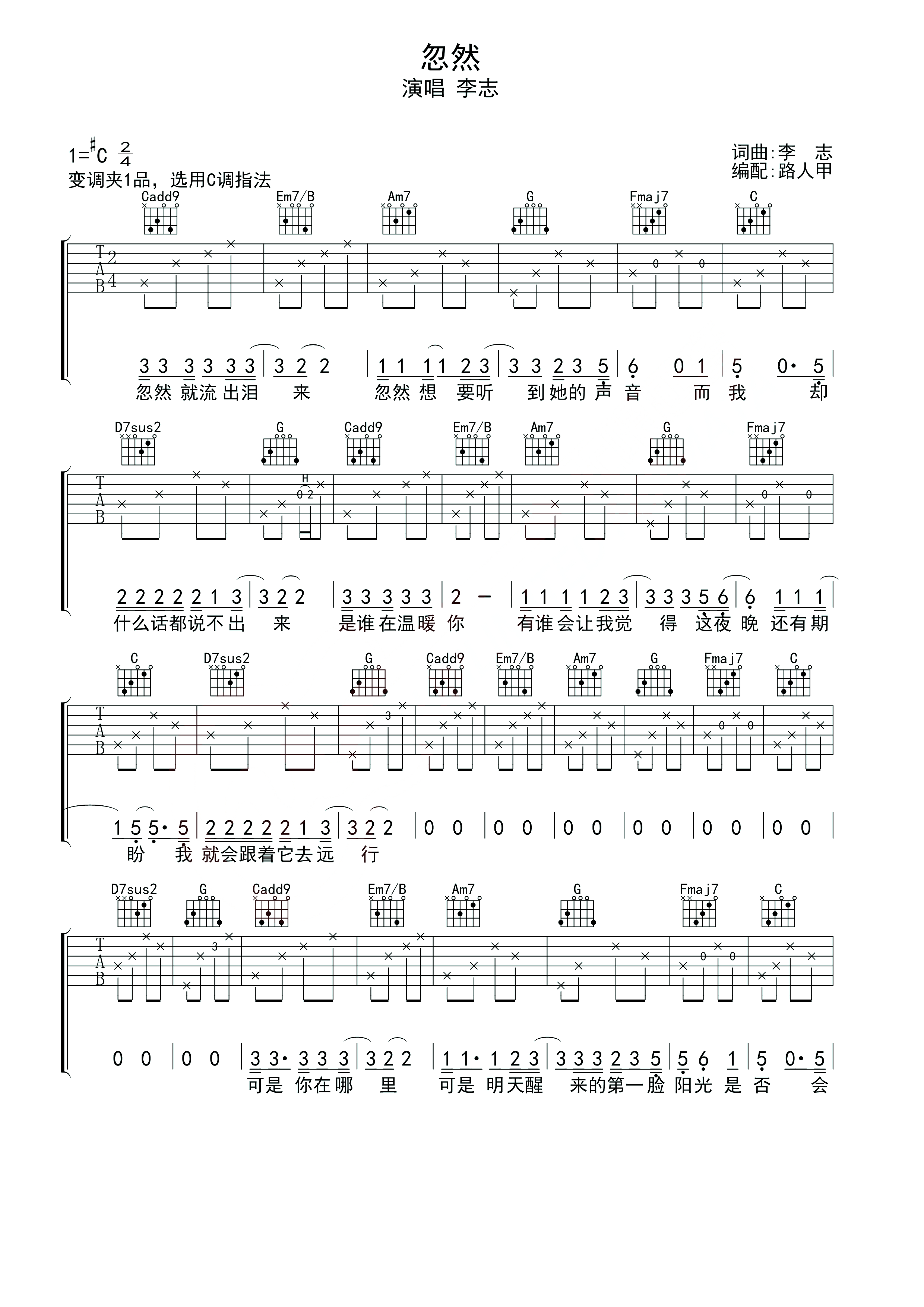 吉他李志《忽然》吉他谱_吉他弹唱谱_无限延音编配