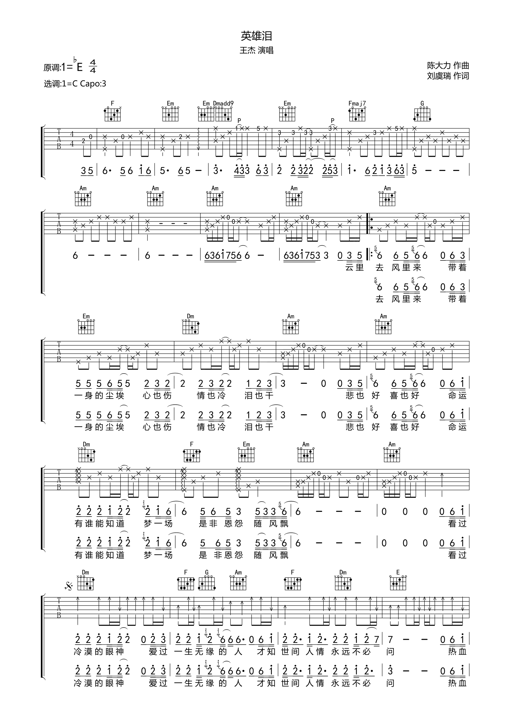 王杰《英雄泪》吉他谱,共有2张高清图谱,免翻页排版设计。...