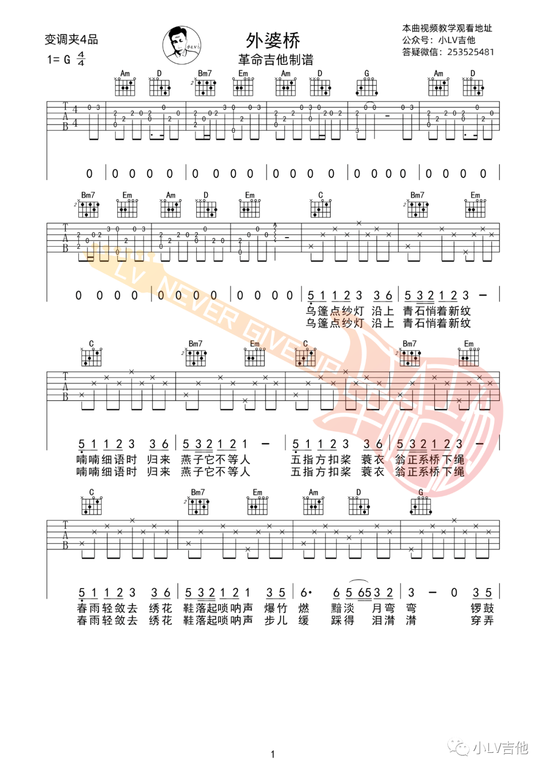 任然《外婆桥》吉他谱,革命吉他编配出品,共有3张高清图谱。...