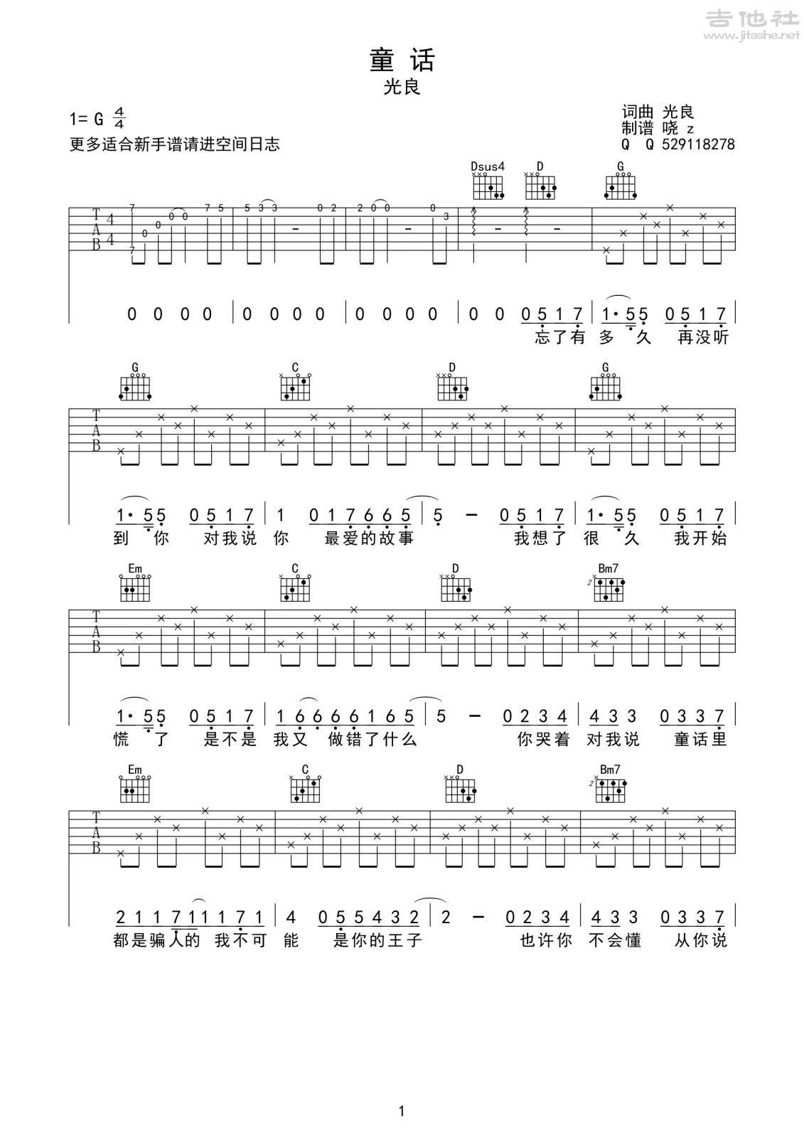 吉他光良《童话》吉他谱_吉他弹唱谱_晓Z编配