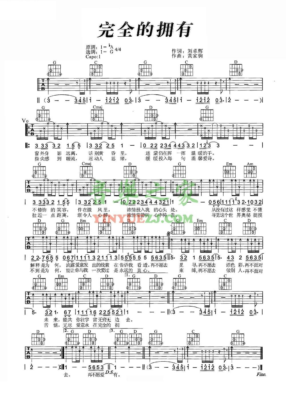 吉他Beyond《完全的拥有》吉他谱_吉他弹唱谱_YYZJ编配
