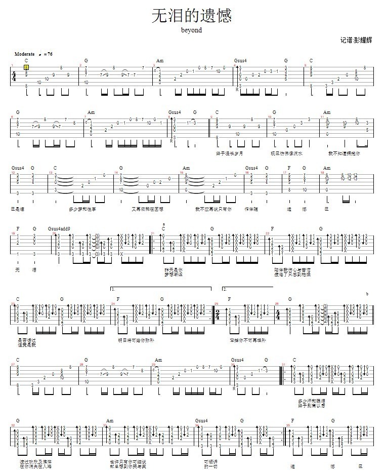 吉他Beyond《无泪的遗憾》吉他谱_吉他弹唱谱
