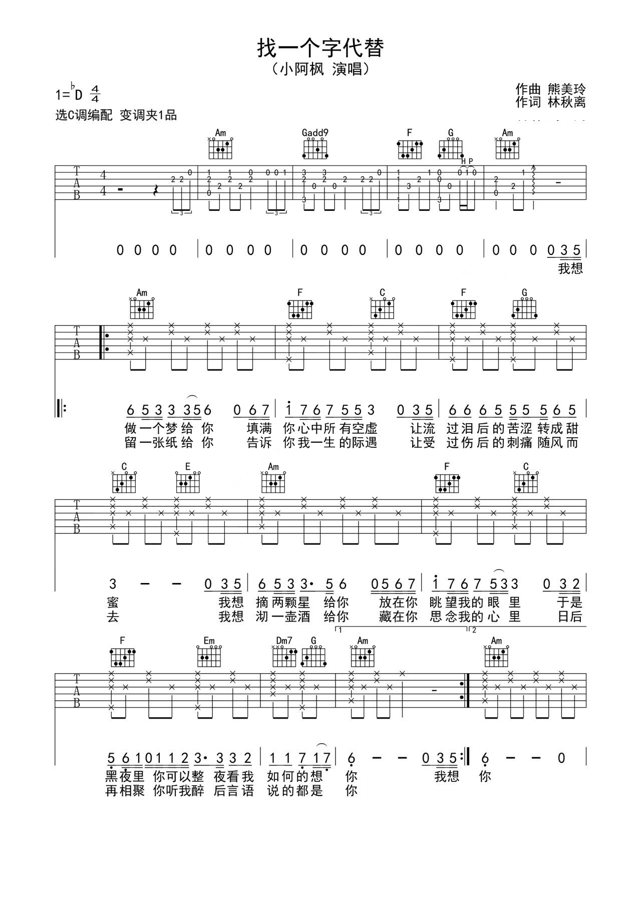 吉他邰正宵/小阿枫《找一个字代替》吉他谱_吉他弹唱谱