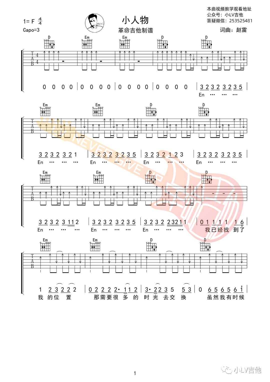 赵雷《小人物》吉他谱,革命吉他编配出品,共有5张高清图谱。...