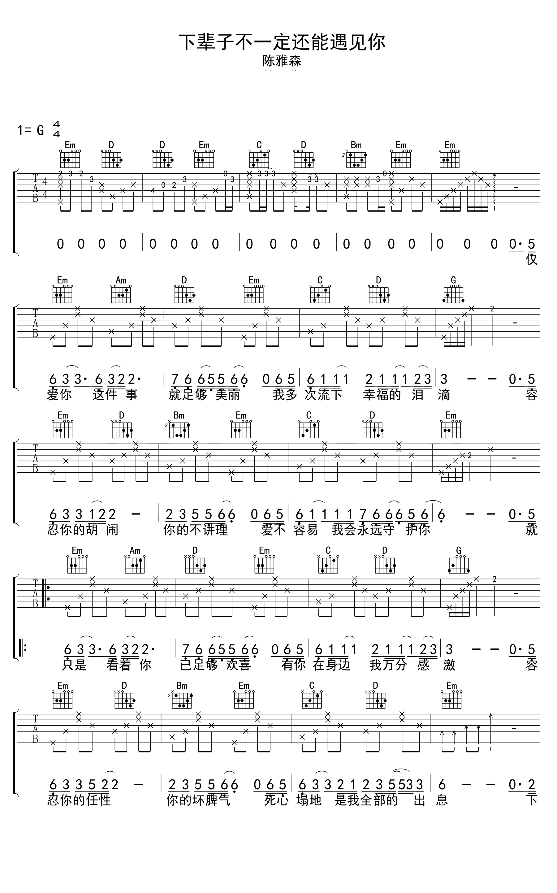 吉他陈雅森《下辈子不一定还能遇见你》吉他谱_吉他弹唱谱_吉他专家编配