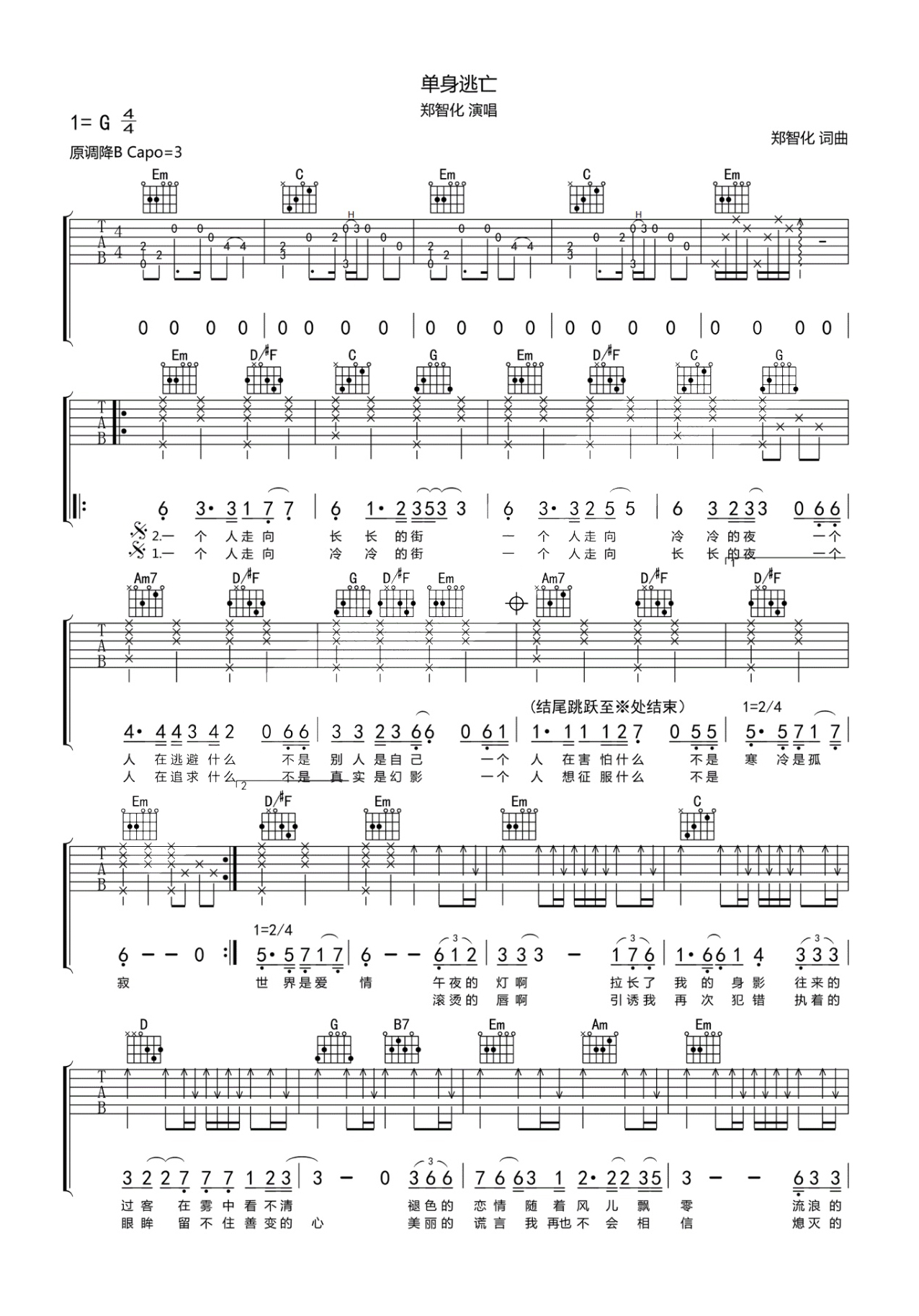 郑智化《单身逃亡》吉他谱,共有2张高清图谱,免翻页排版设计。...