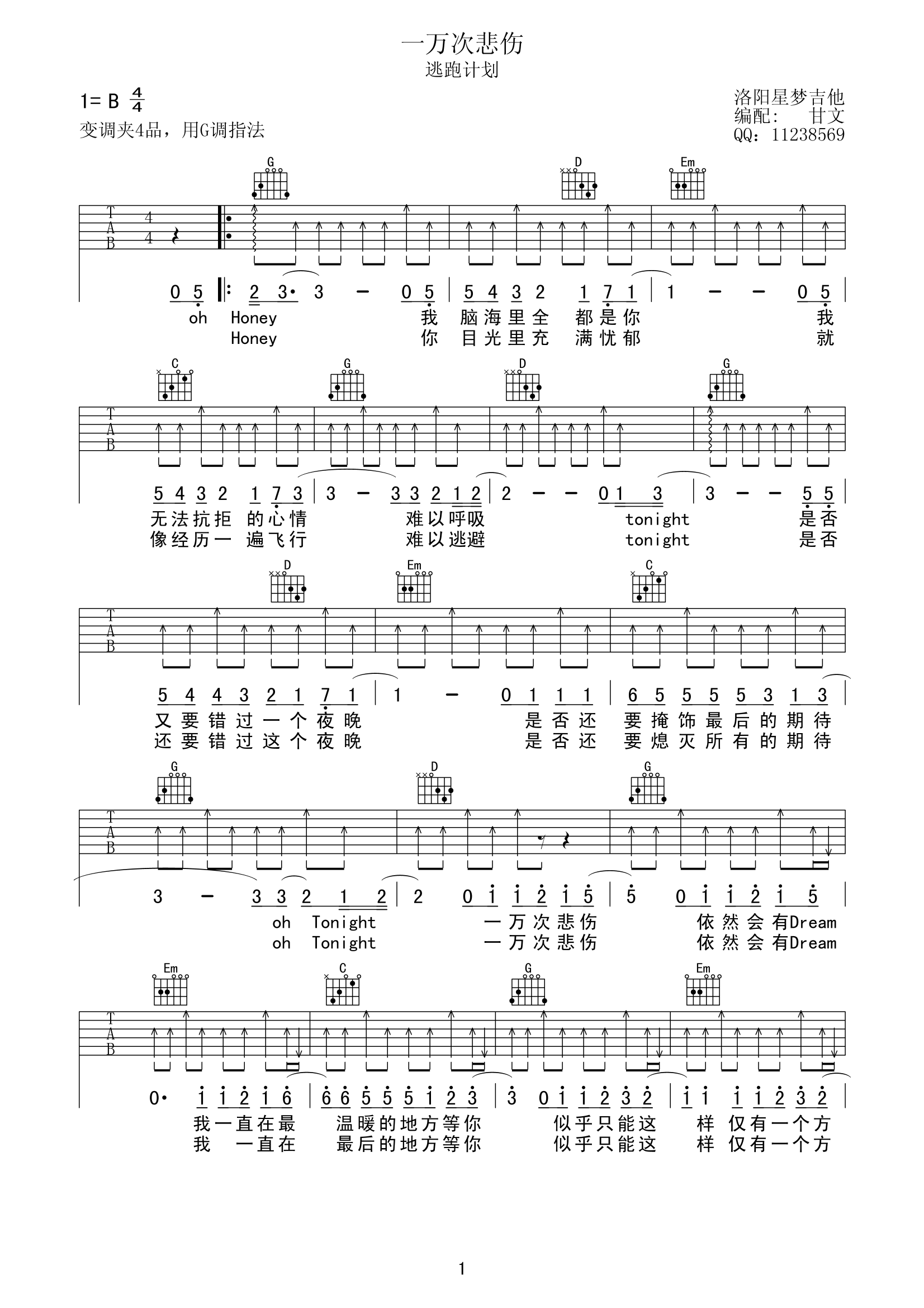 吉他逃跑计划《一万次悲伤》吉他谱_吉他弹唱谱_甘文编配