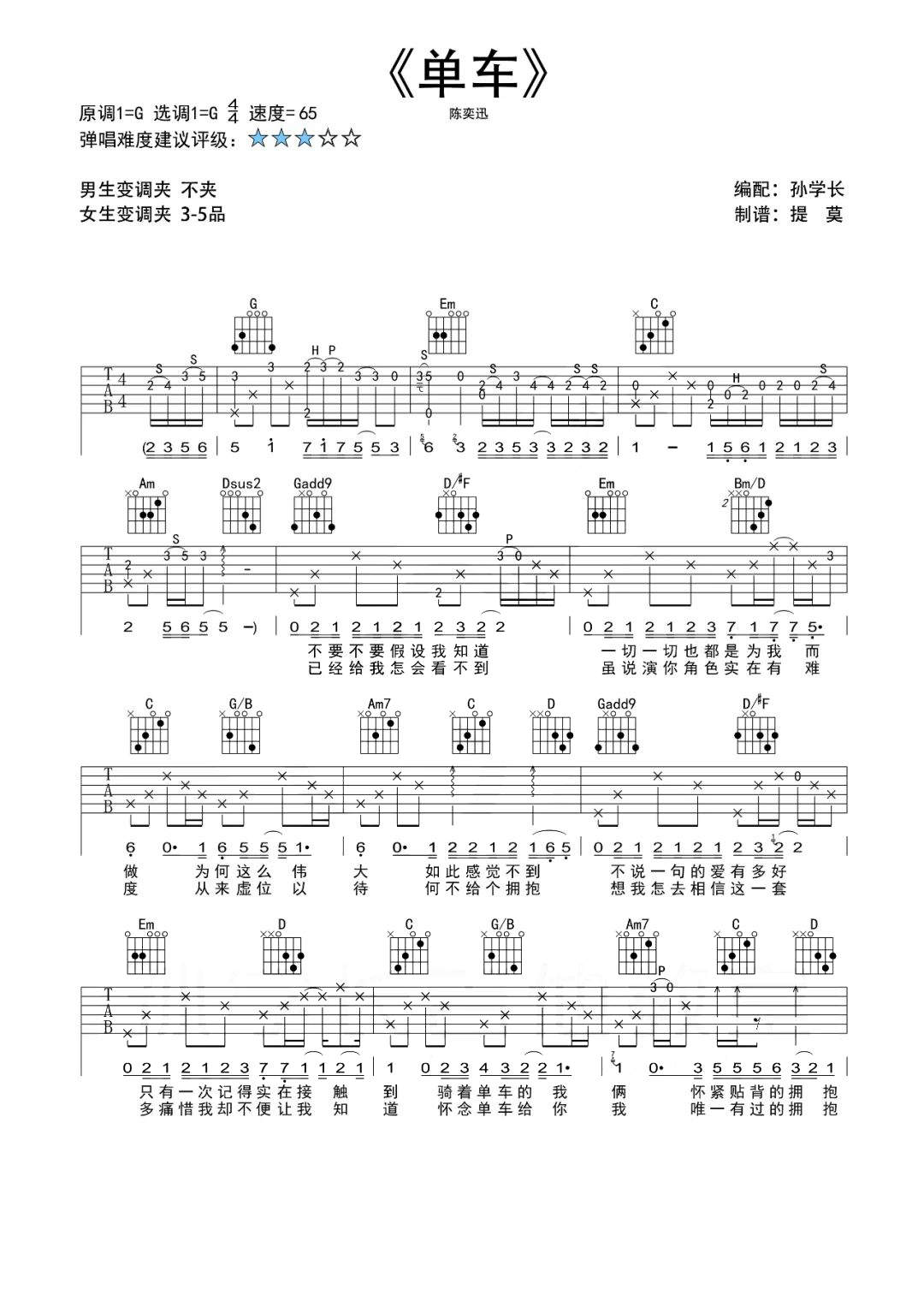 吉他陈奕迅《单车》吉他谱_吉他弹唱谱_孙学长吉他教室编配