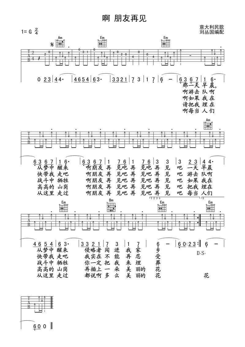 吉他意大利民歌《啊朋友再见》吉他谱_吉他弹唱谱