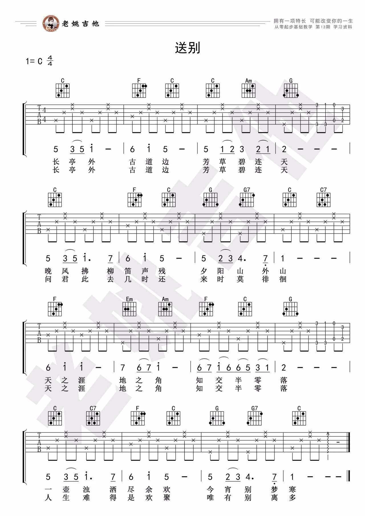 吉他李叔同《送别》吉他谱_吉他弹唱谱_老姚吉他编配