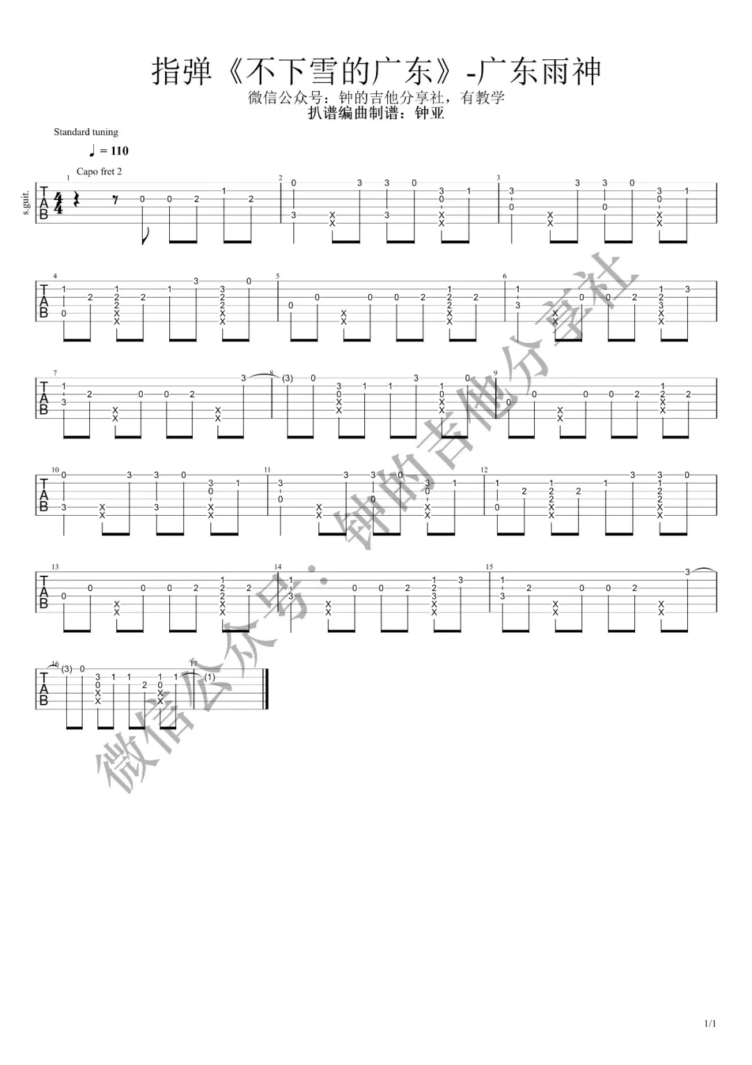 吉他广东雨神《不下雪的广东》吉他谱_吉他指弹六线谱_钟亚编配