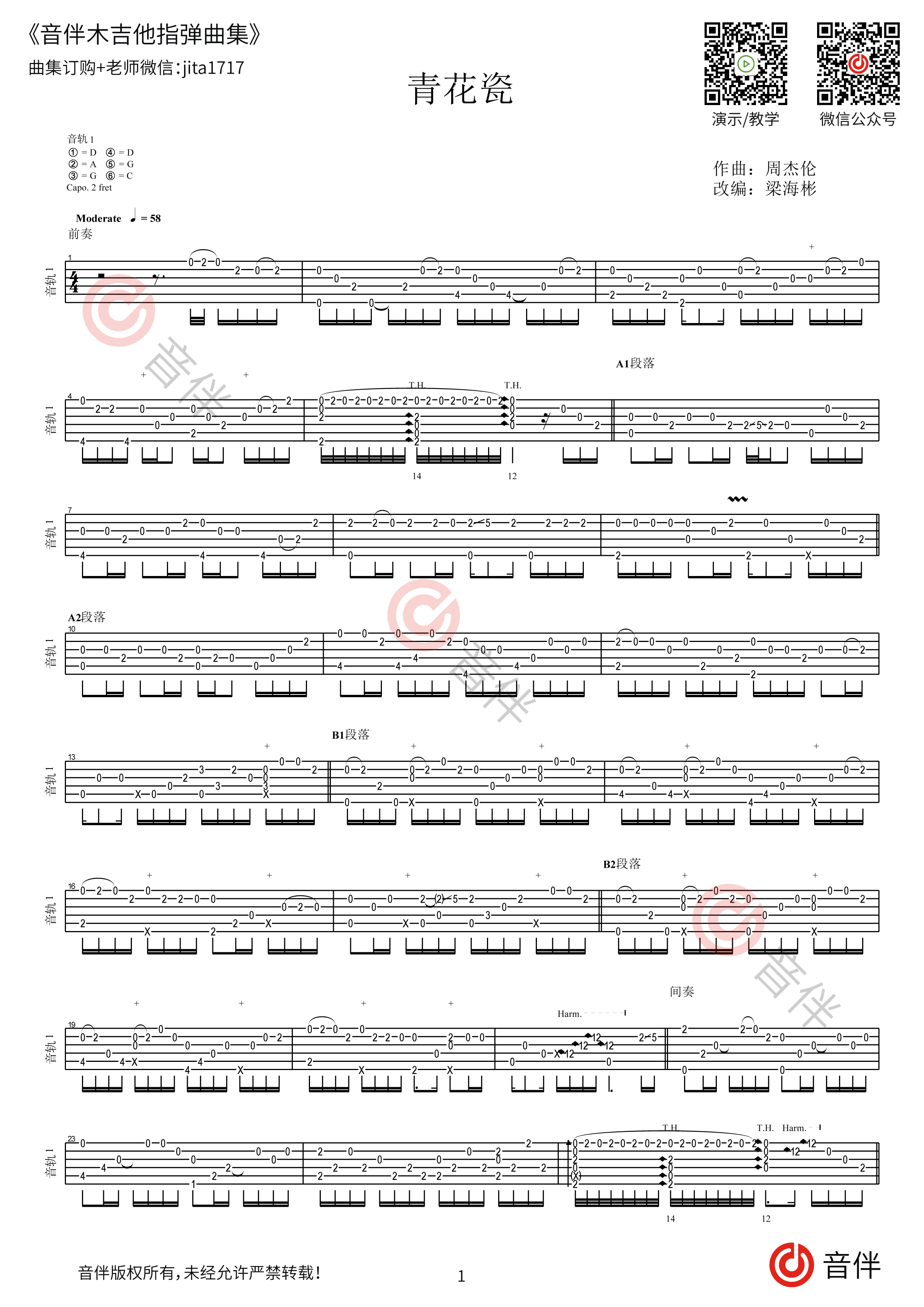 周杰伦《青花瓷》吉他谱,音伴编配出品,共有2张高清图谱,免翻页排版设计。...