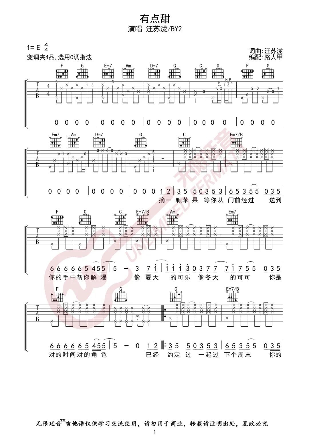 吉他汪苏泷/BY2《有点甜》吉他谱_吉他弹唱谱_无限延音编配