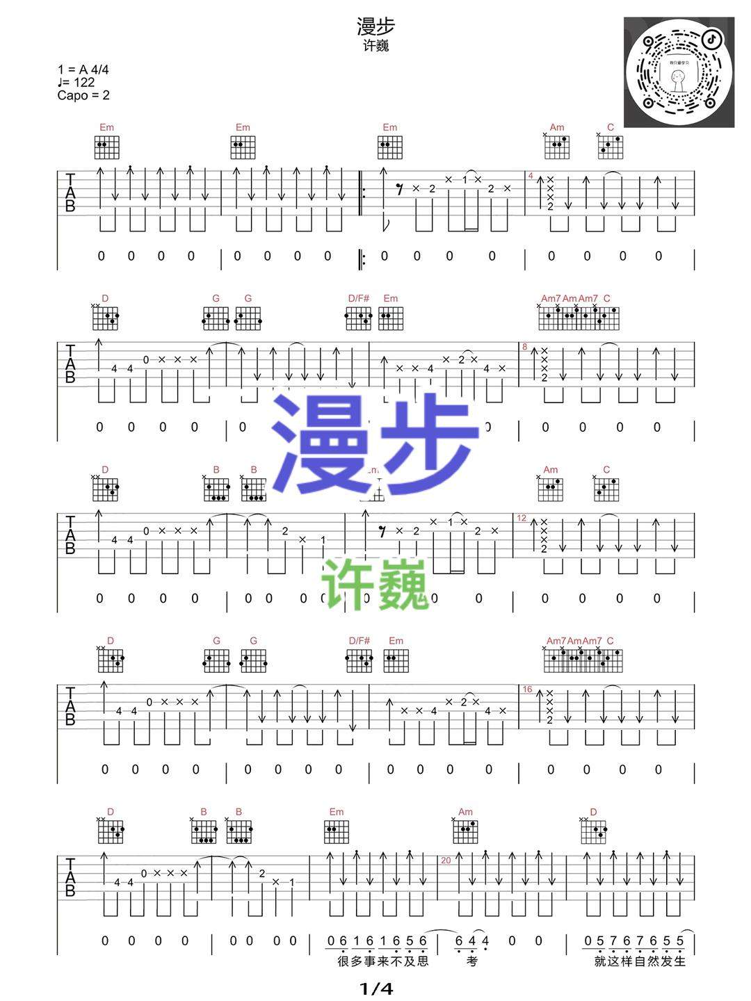 许巍《漫步》吉他谱,共有4张高清图谱。...