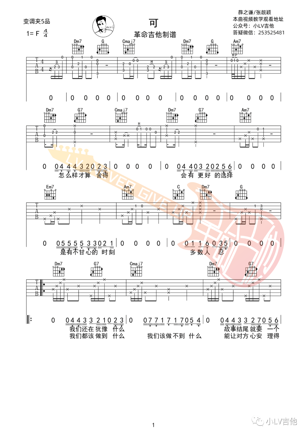薛之谦/张靓颖《可》吉他谱,革命吉他编配出品,共有3张高清图谱。...