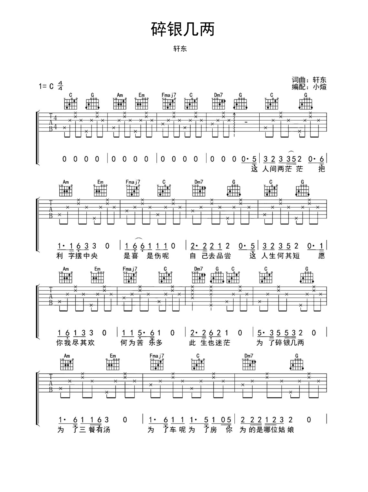 碎银几两吉他谱,轩东的一首网络热门歌曲。人世匆匆而过,只为一些微不足道的财富。它能够解救人们的烦忧,以赐予父母健康,庇佑子女茁壮成长。《碎银几两》吉他弹唱谱,选用C调指法,原调编配,演奏时不需要使用变调夹,共三张图片六线谱,小煊老师制谱分享,吉他事网站上传。 我们依赖自...