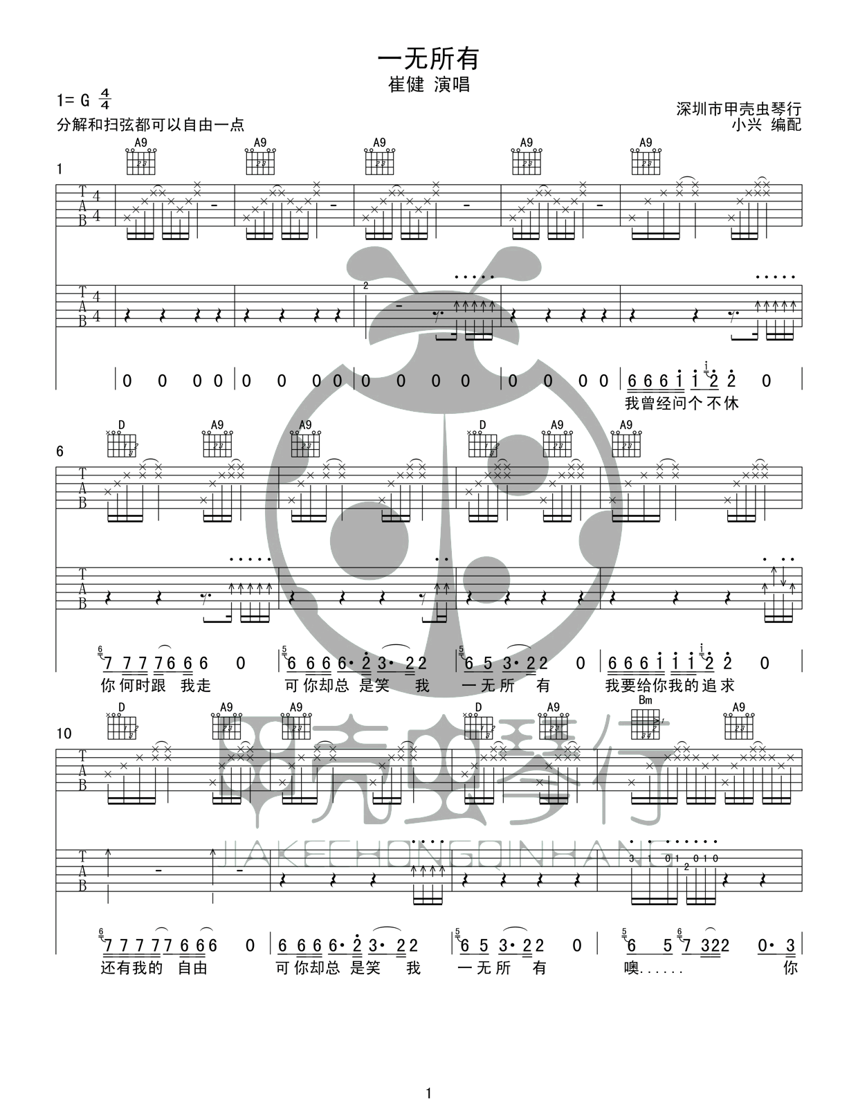 吉他崔健《一无所有》吉他谱_吉他弹唱谱_甲壳虫琴行编配