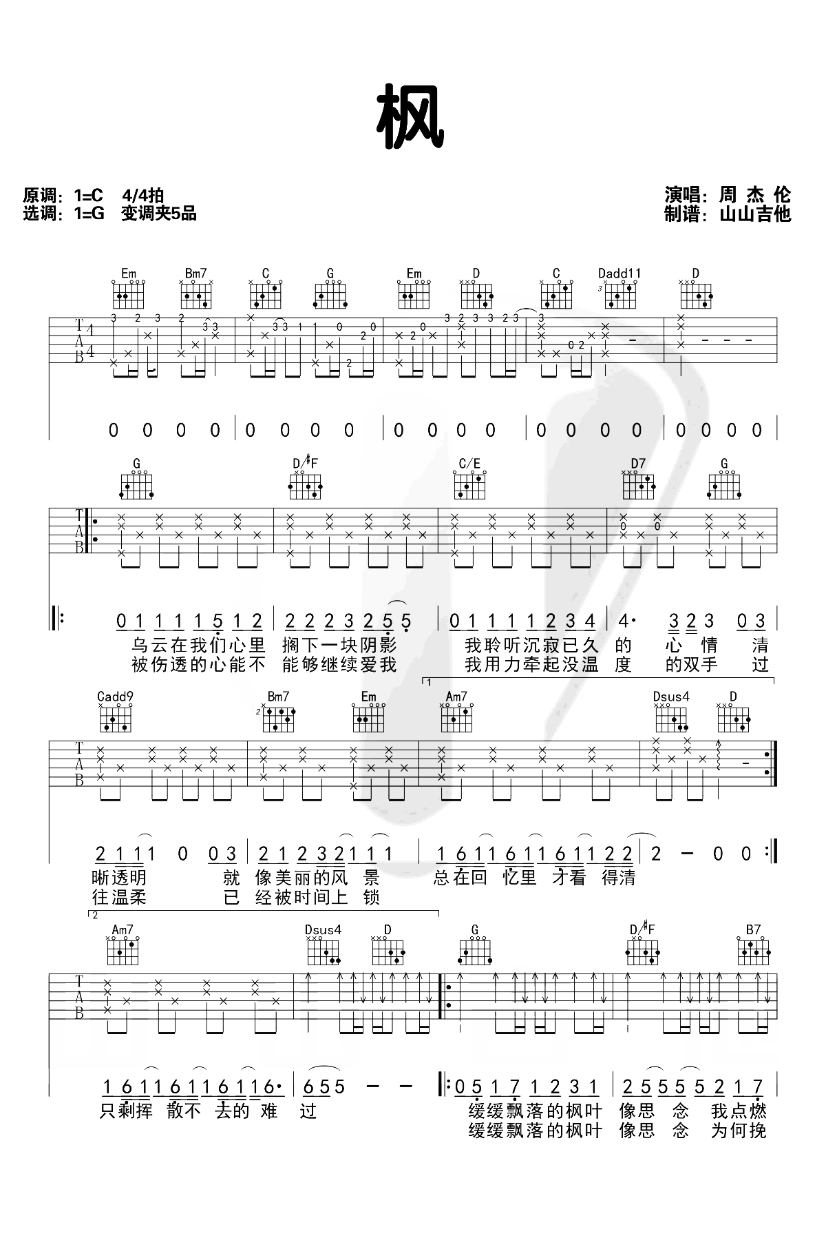 吉他周杰伦《枫》吉他谱_吉他弹唱谱_山山吉他编配