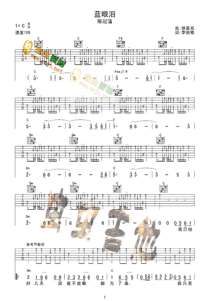 吉他陈冠蒲《蓝眼泪》吉他谱_吉他弹唱谱