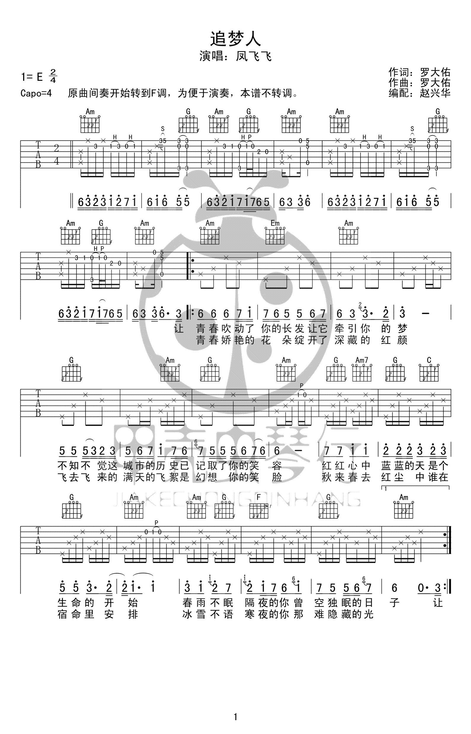 吉他凤飞飞《追梦人》吉他谱_吉他弹唱谱_甲壳虫琴行--赵兴华编配