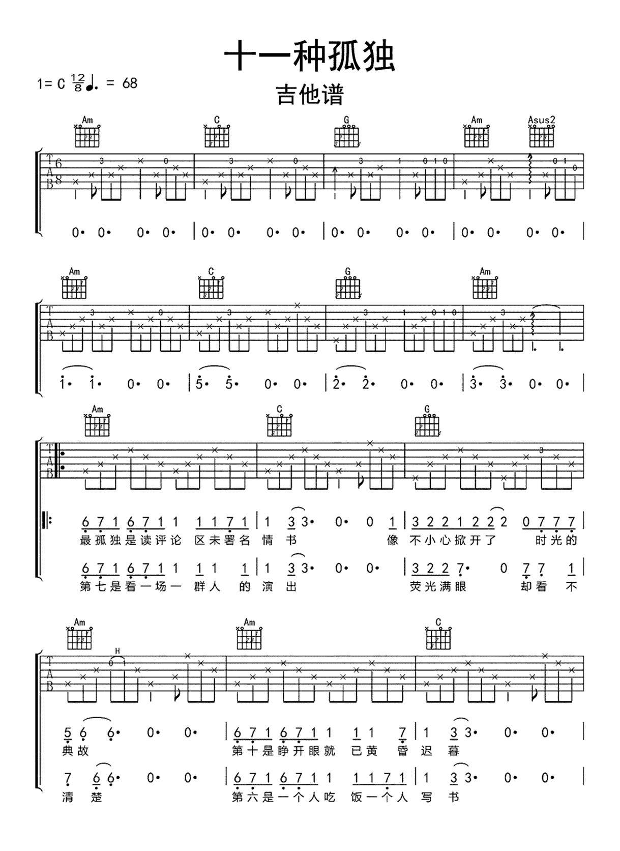 吉他网络歌手《十一种孤独》吉他谱_吉他弹唱谱