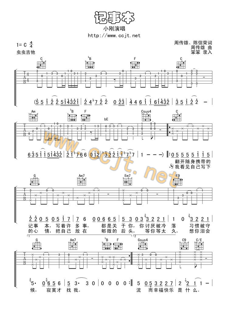 吉他小刚/周传雄《记事本》吉他谱_吉他弹唱谱_虫虫吉他编配