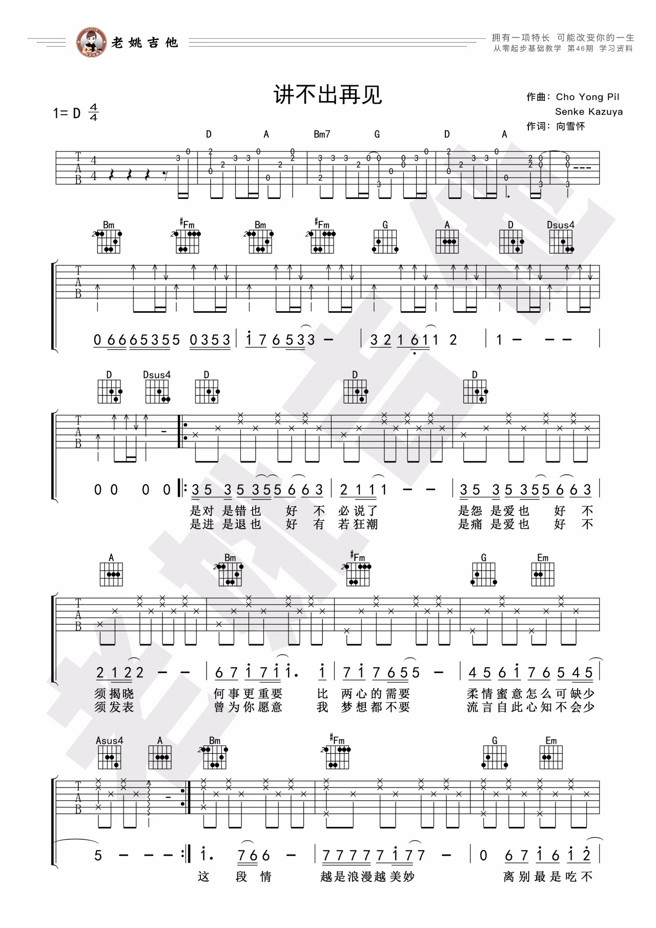 吉他谭咏麟《讲不出再见》吉他谱_吉他弹唱谱_老姚吉他编配