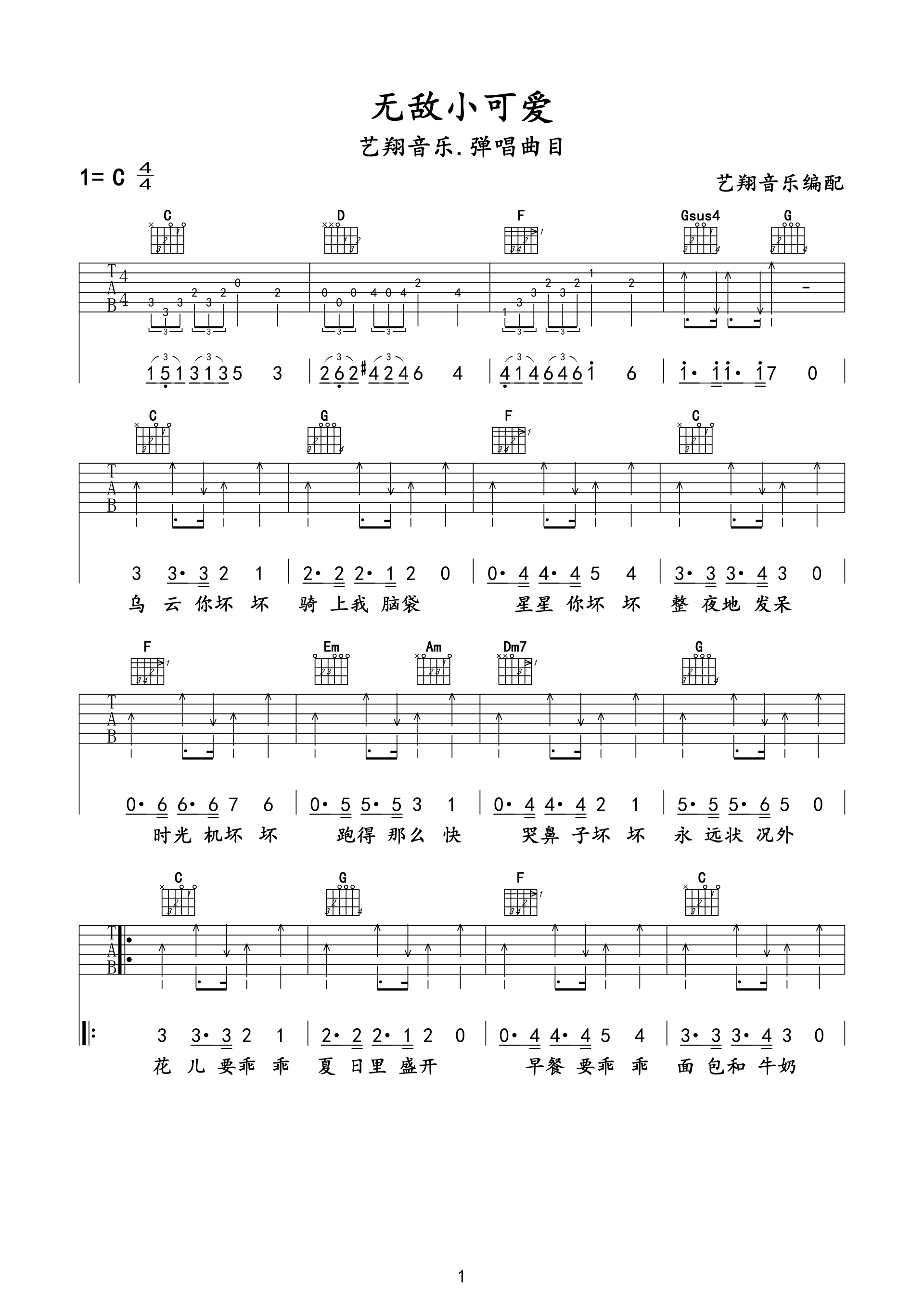 吉他儿歌《无敌小可爱》吉他谱_吉他弹唱谱