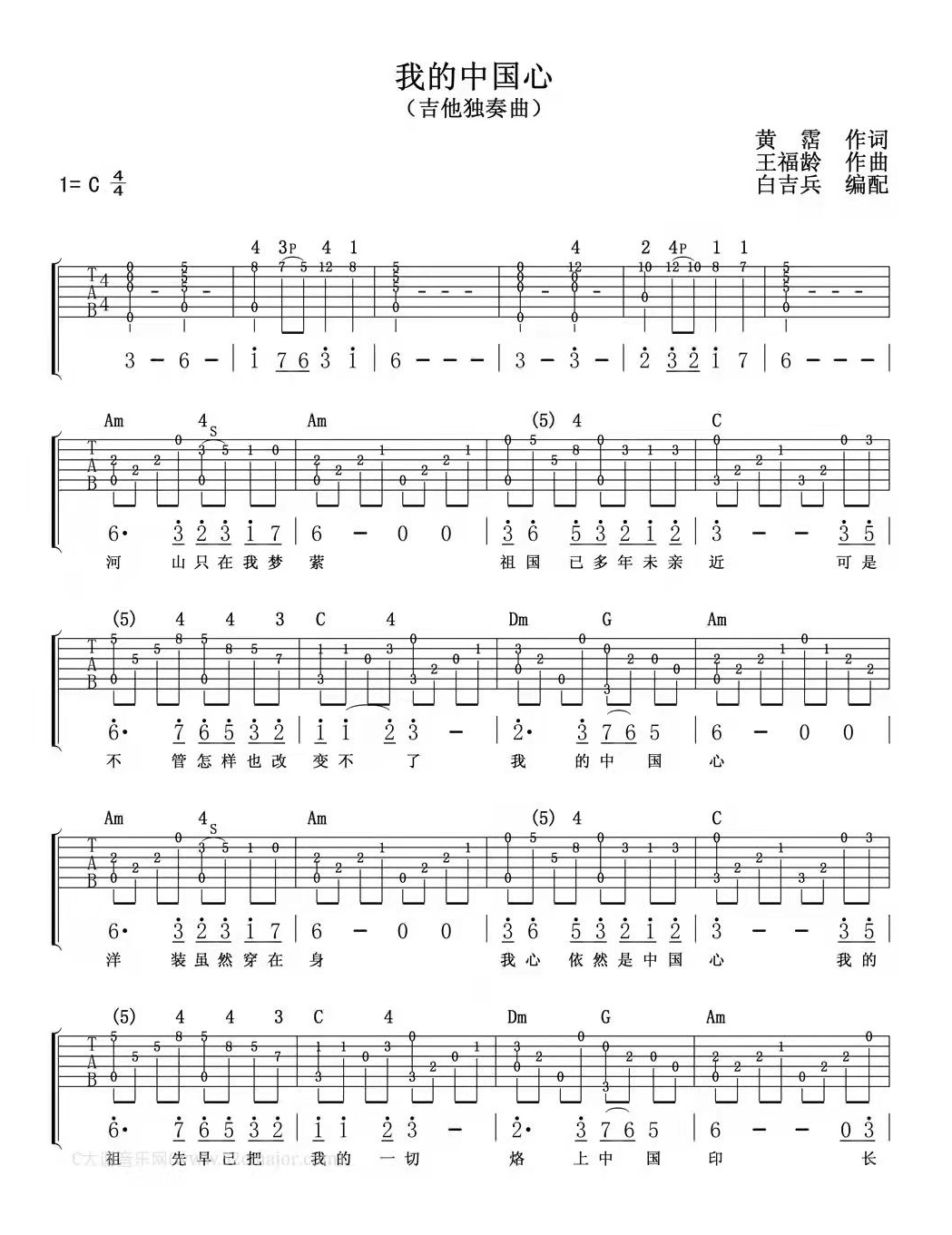 张明敏《我的中国心》吉他谱,白吉兵编配出品,共有2张高清图谱,免翻页排版设计。...